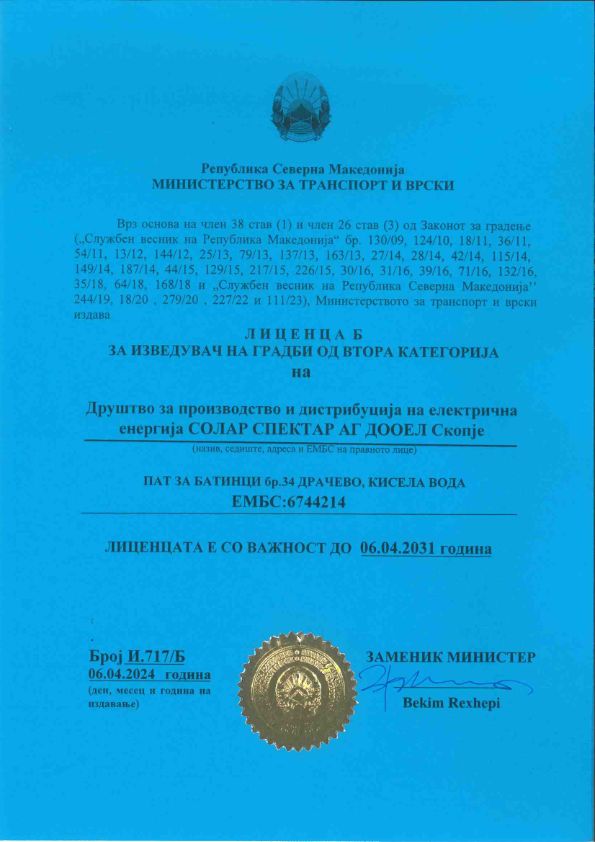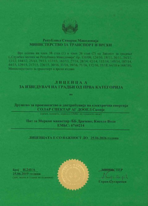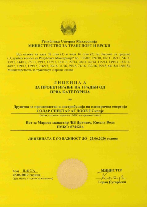 Лиценци и сертификати Лиценца А – за изведувач на градби од прва категорија Лиценца А – за проектирање на градби од прва категорија Лиценца Б – за изведувач на градби од втора категорија Лиценца Б – за проектирање на градби од втора категорија Лиценца Б - за надзор над изградба на градби од втора категорија
