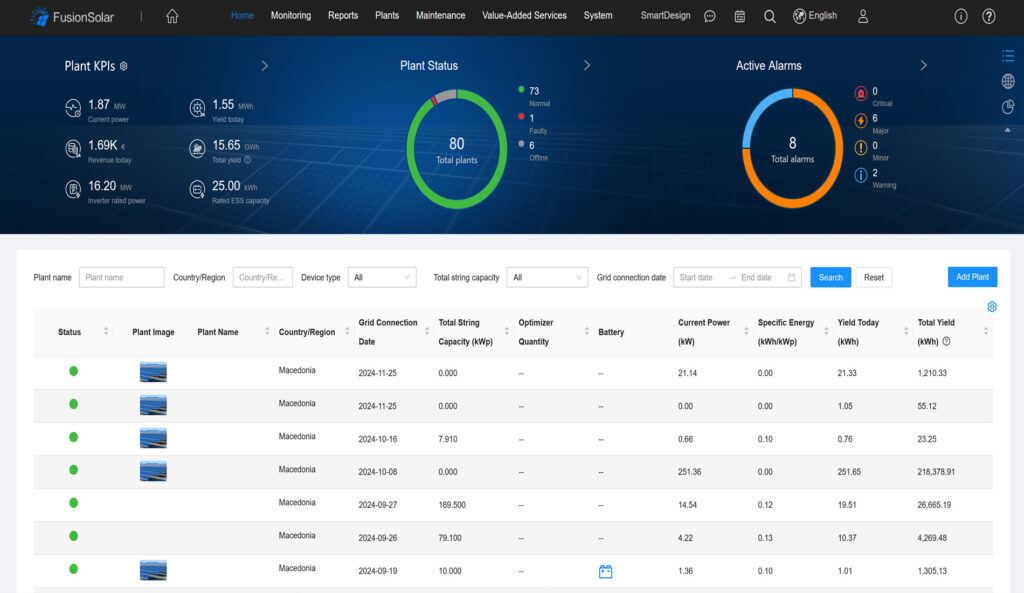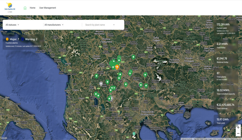 Увидот врз работата на фотоволтаичната електрична централа, како и следењето на перформансите на истата се овозможени со 24/7 далечински мониторинг систем. Вие и тимот на Солар Спектар АГ со помош на постојаниот мониторинг имате целосен увид во работата на Вашата фотоволтаичната централа. Освен следењето на производството, мониторинг системот овозможува нашиот тим 24/7 да ја има на дланка Вашата фотоволтаична централа и да има увид во перформансите на компонентите и во случај на детекција на било каква грешка да може да дејствува веднаш, со цел овозможување непречено функционирање на централата.
